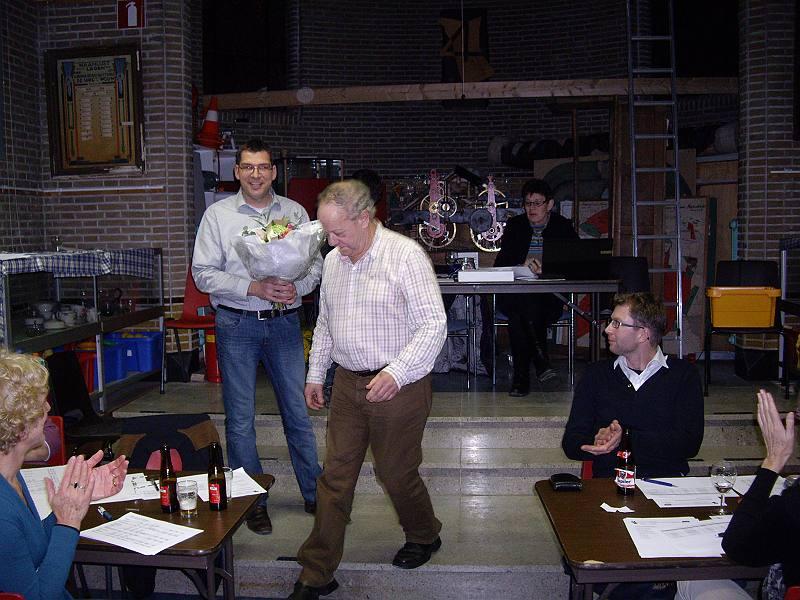Ook de voorzitter zelf neemt afscheid als voorzitter, maar blijft bestuurslid. Het bloemetje is hem uitgereikt door de nieuwe voorzitter. (de camera was wat traag)