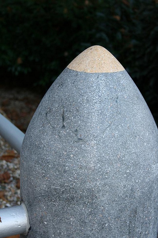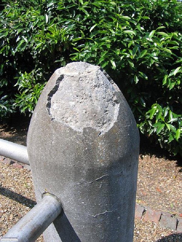 | De granieten granaat rechts voor. Voor en na de restauaratie. (inclusief conservering metaal) Foto Kemperman Restauratie Bergen op Zoom 2008 | |