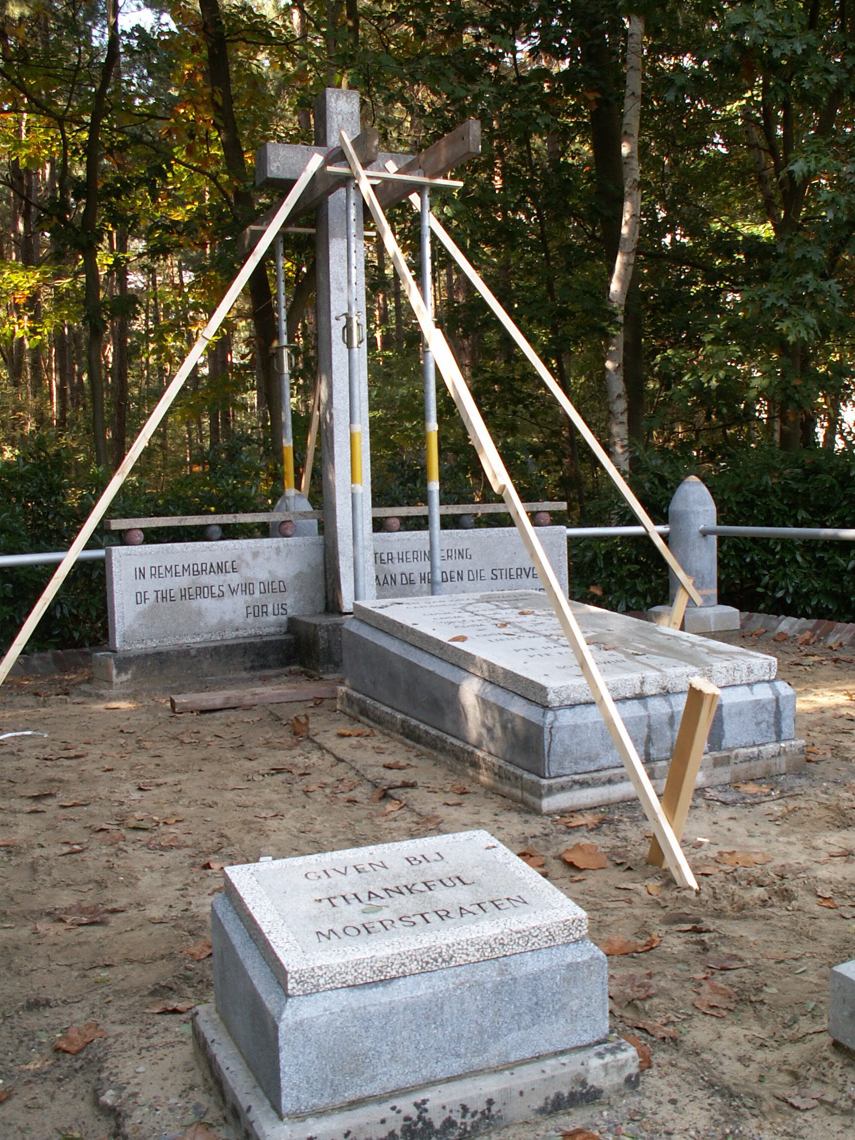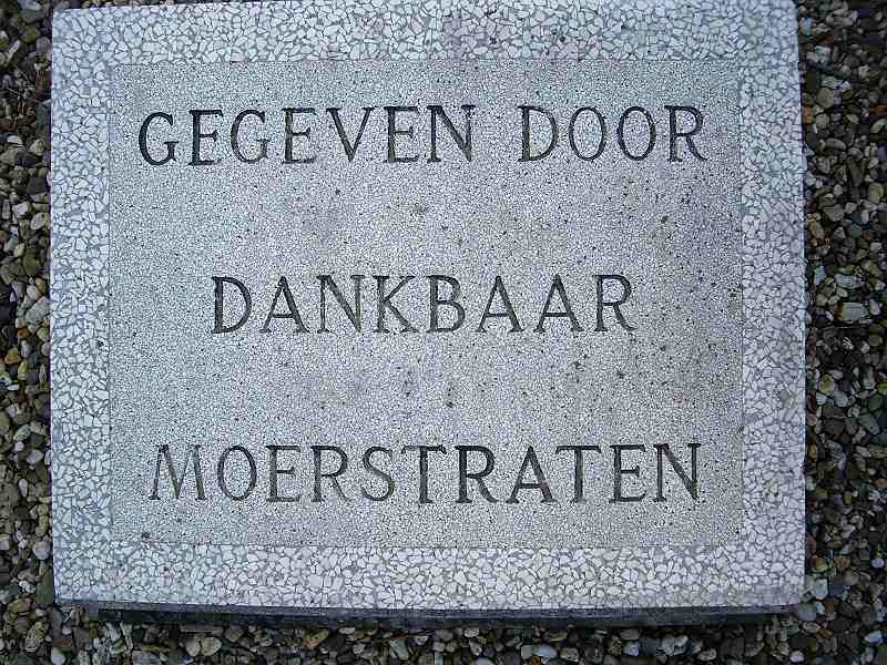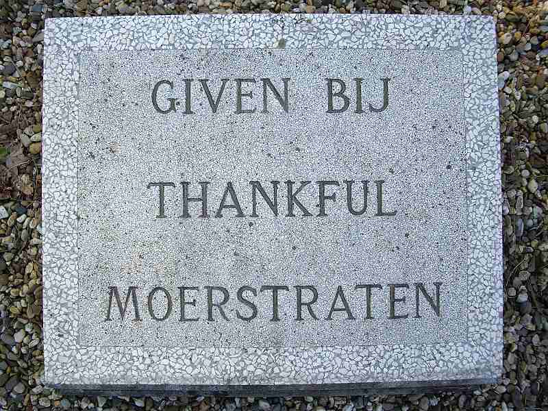 oorlogsmonument in Moerstraten. "In remembrance of the heroes". In het midden een grafsteen met de namen van negen gevallen militairen. Aan de achterzijde een staand kruis met in het hart het embleem van de Canadese legereenheid. Achter het kruis een gedenkplaat. Aan de voorzijde twee plaquettes met een dankwoord van de inwoners van Moerstraten. Het geheel wordt omheind door negen grote, aan elkaar verbonden granieten granaten. Foto Toon Schijven 2011 |